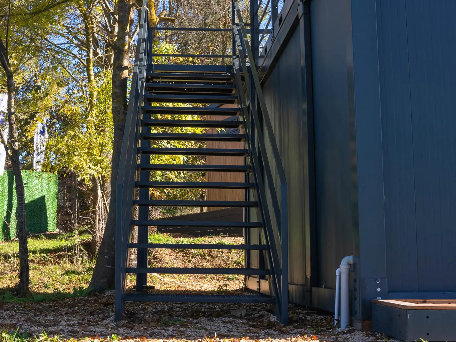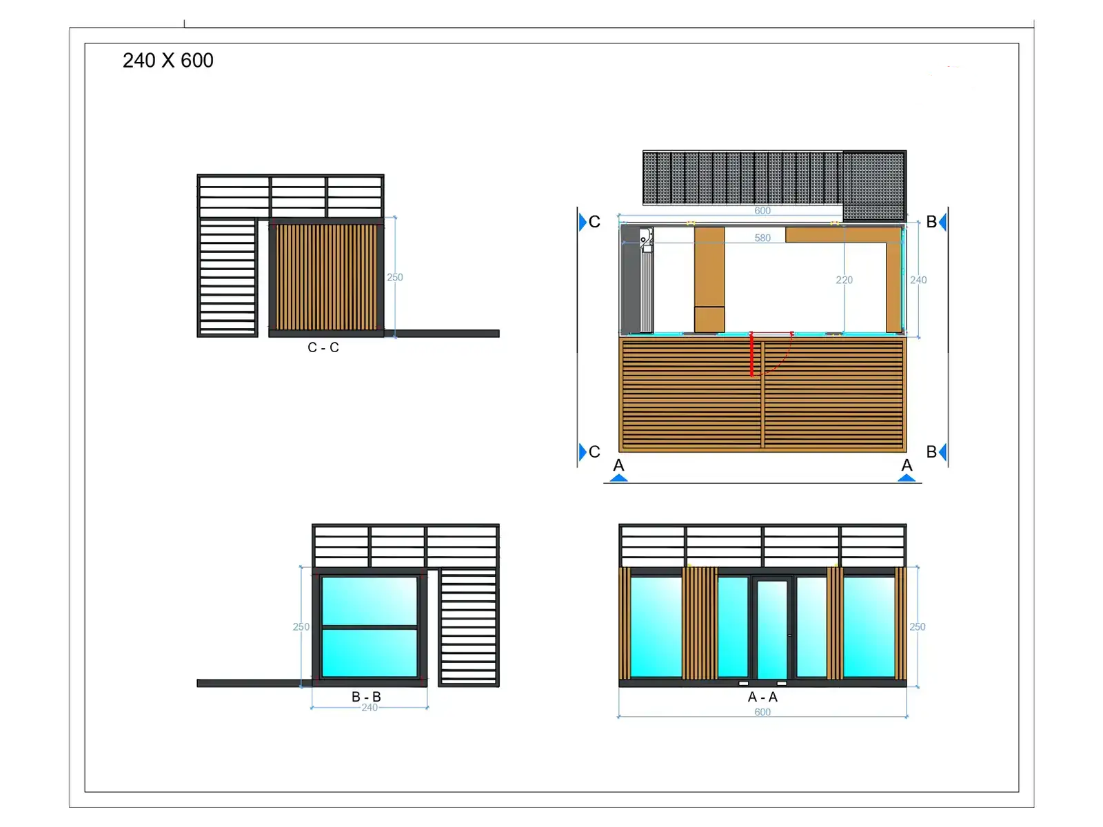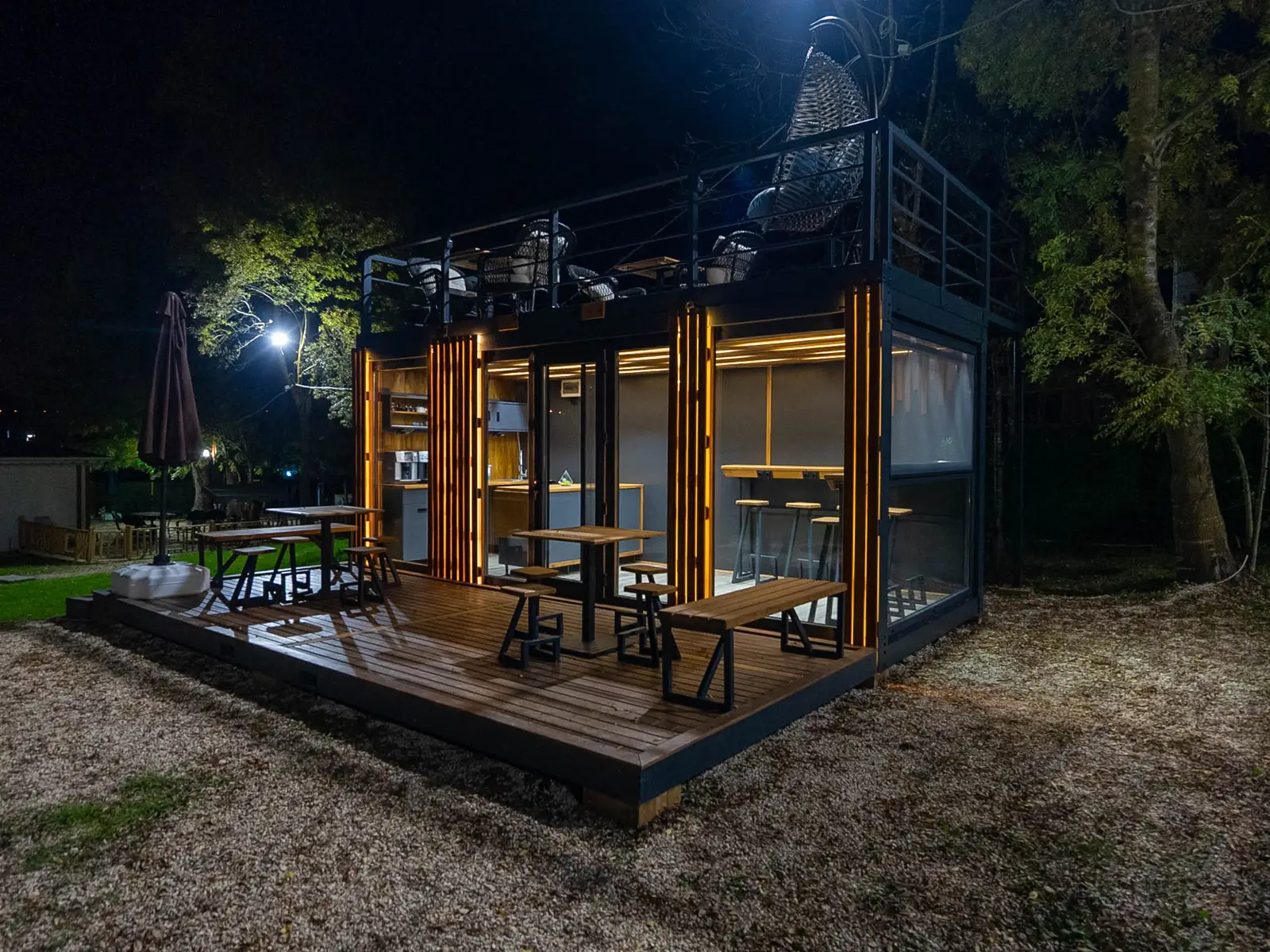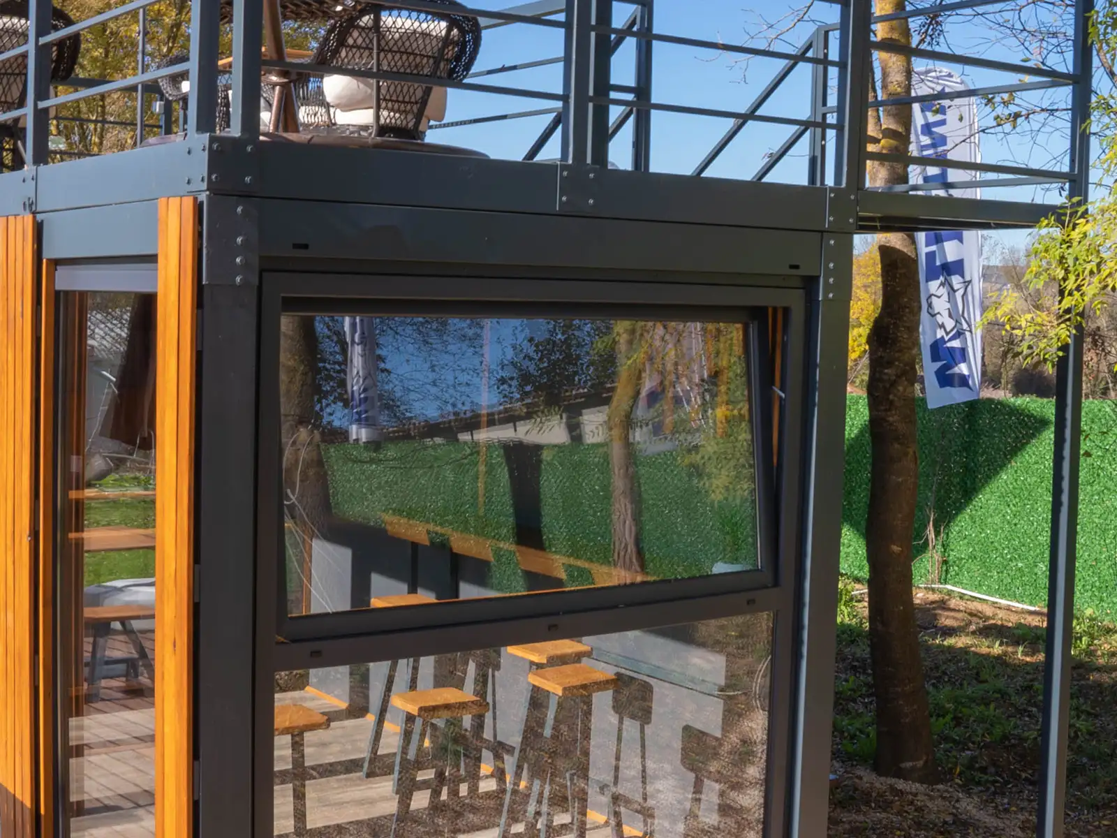 Café Conteneur Fenêtres du sol au plafond avec boiseries, 1 x grande pièce, 1 x porte d’entrée en verre plus accessoire
